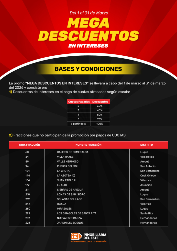 Este tipo de promociones son una oportunidad ideal para quienes desean regularizar su lote o terreno en Paraguay pagando menos intereses.