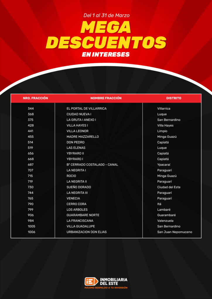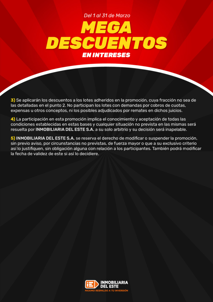 Los Mega Descuentos en Intereses de Inmobiliaria del Este son una promoción especial que permite a los clientes acceder a descuentos en los intereses generados por cuotas pendientes de terrenos.